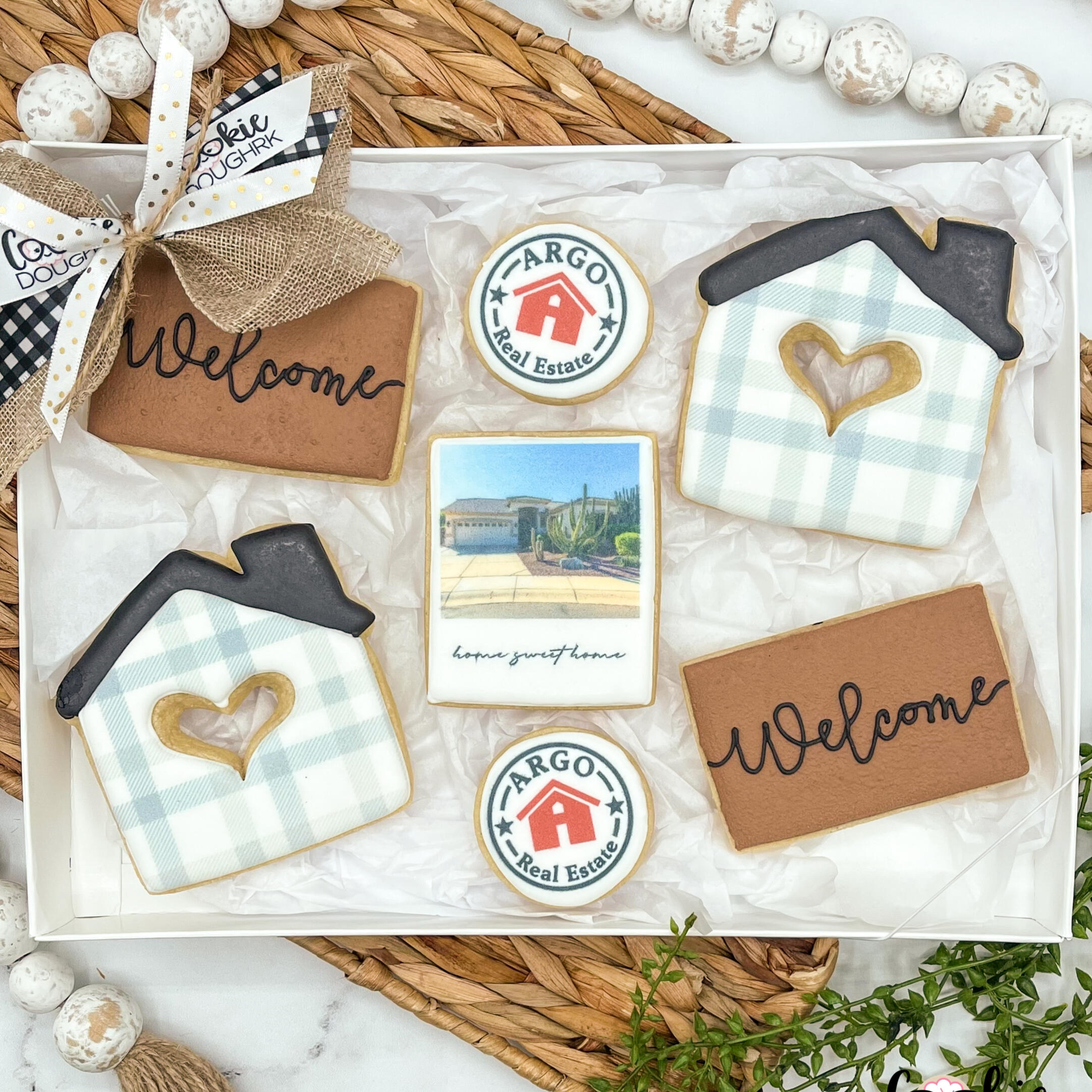 Imagine getting this box as a housewarming gift...perfect, right? The center cookie is a photo of the recipient's house printed directly on the cookie using FDA approved edible ink and the two mini cookies can have a realtor logo or be swapped for mini keys. All cookies are in my Traditional Vanilla Sugar Cookie flavor and come boxed with a bow ready for gifting.Please send the photo you would like printed on the photo cookie to [email protected]. Thank you!Cookies will be picked up in San Tan Valley and chosen pick up date must be at least one week from order date.